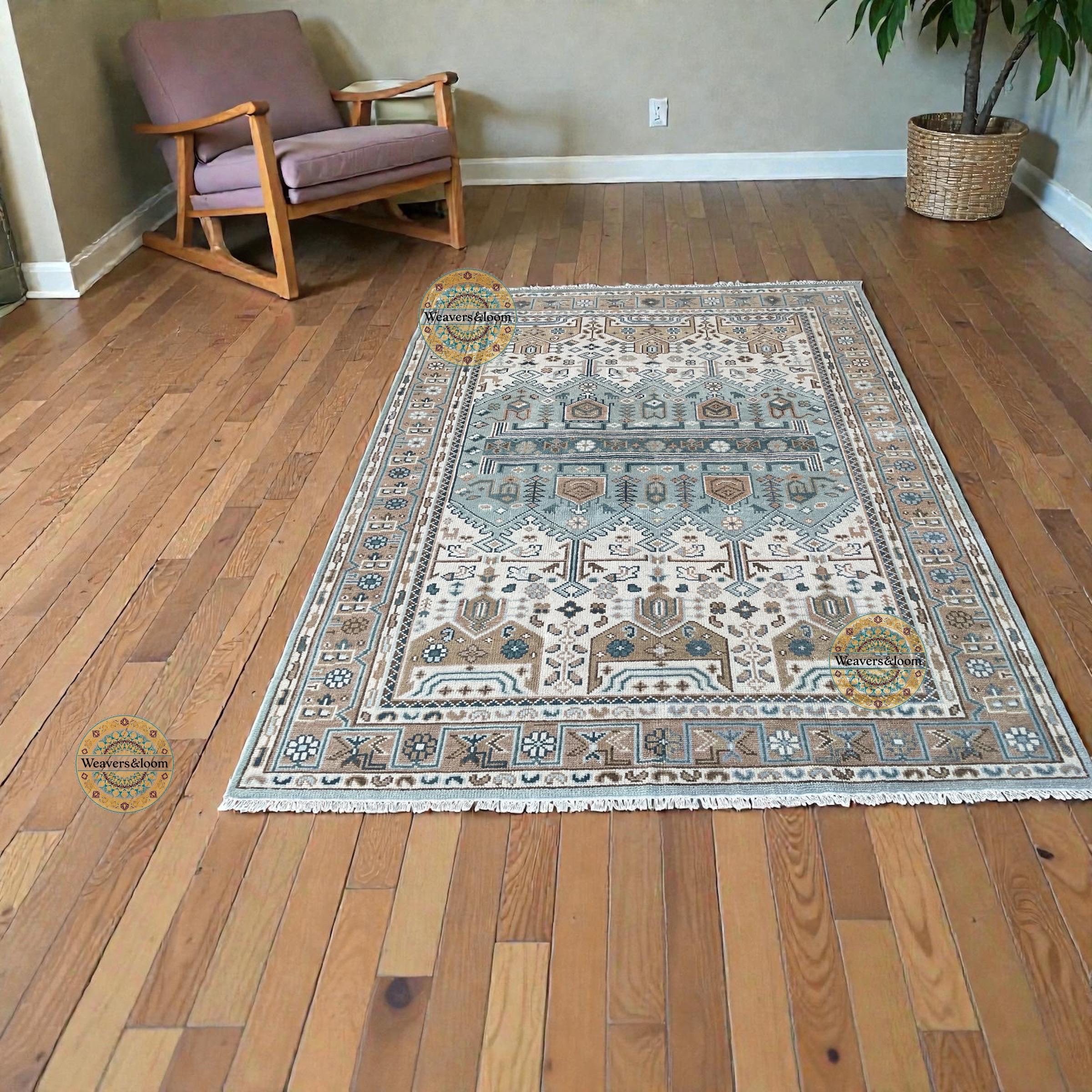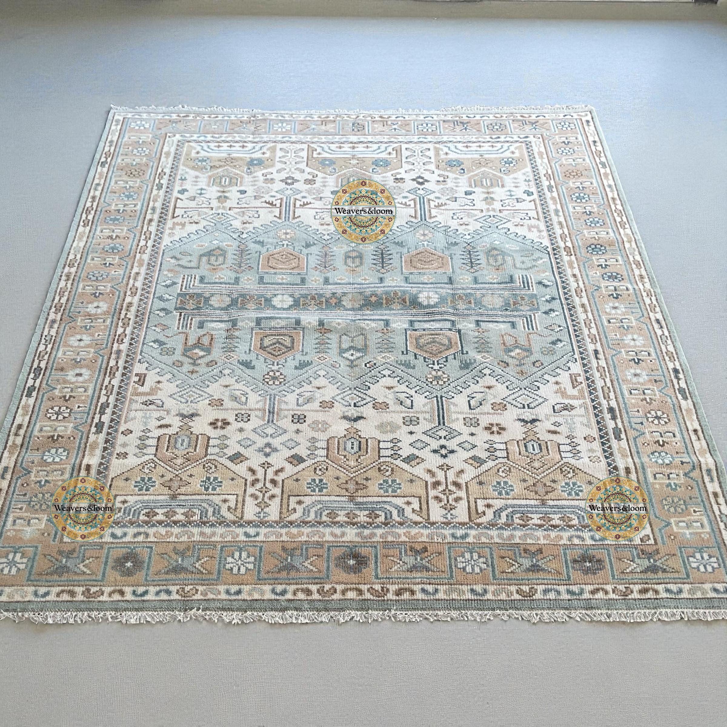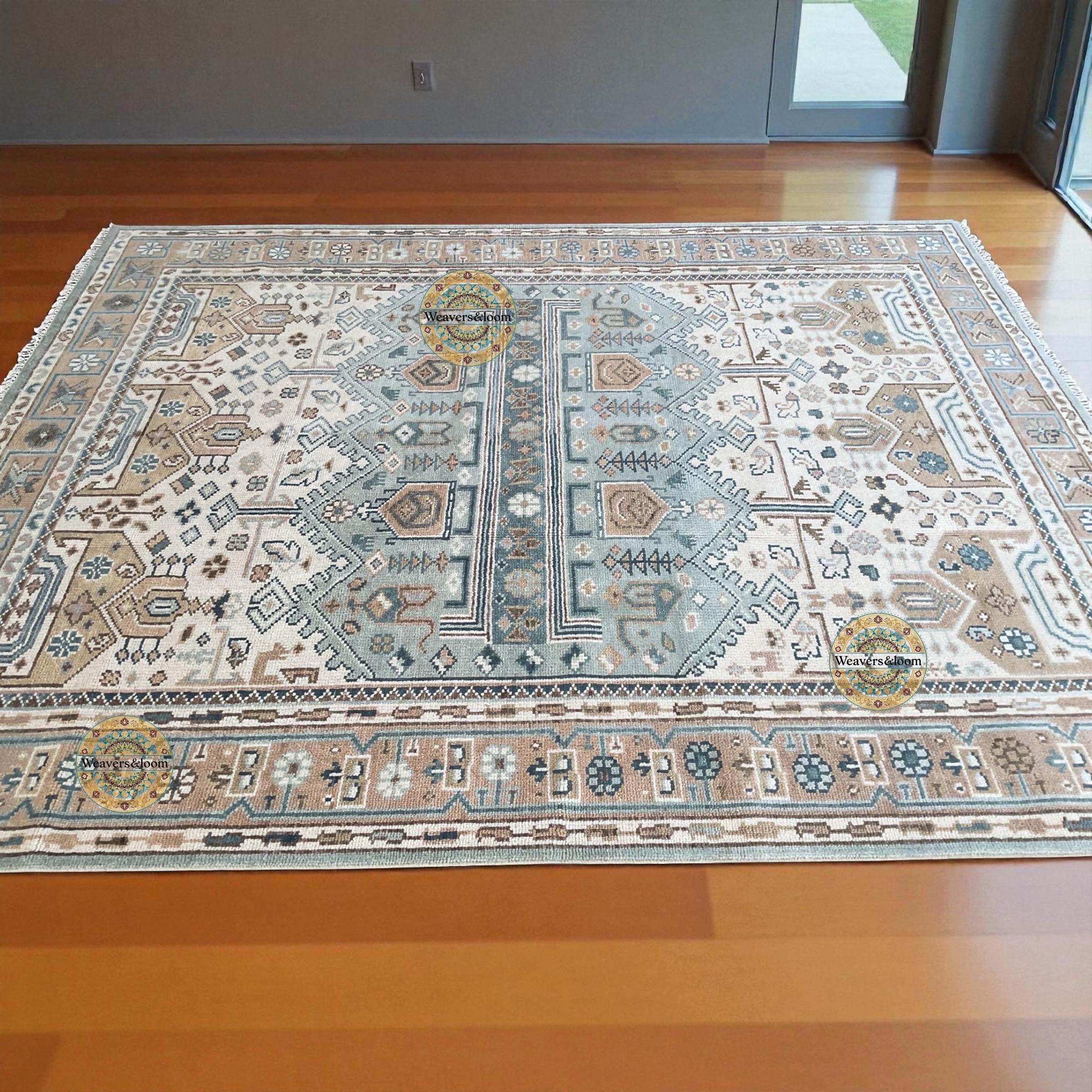 PB Nicolette Hand Knotted Rug, Wool Area Rug for Living room, Dining area, Oushak Rug, Handmade Rug, Beige and Blue Knotted Rug