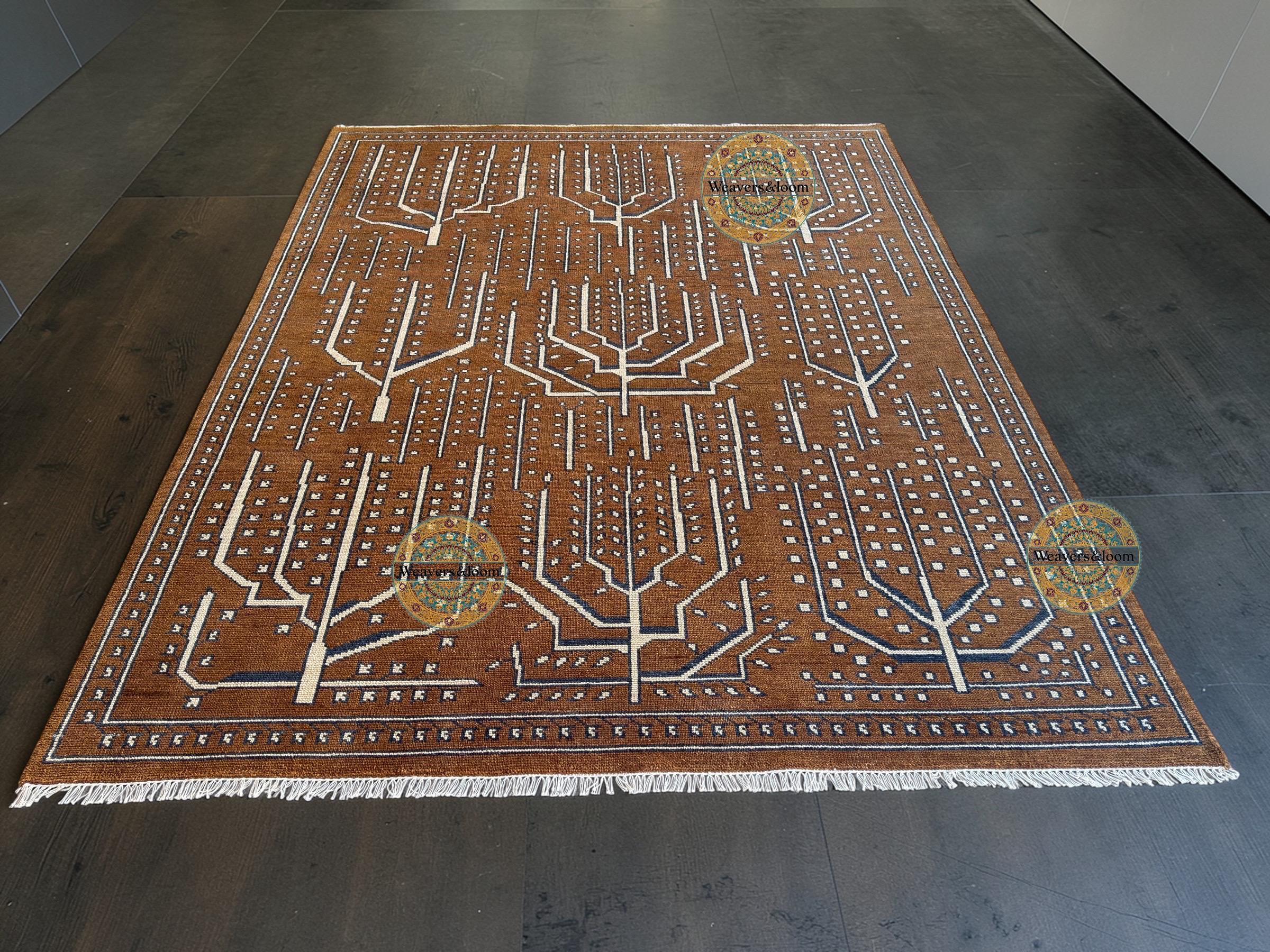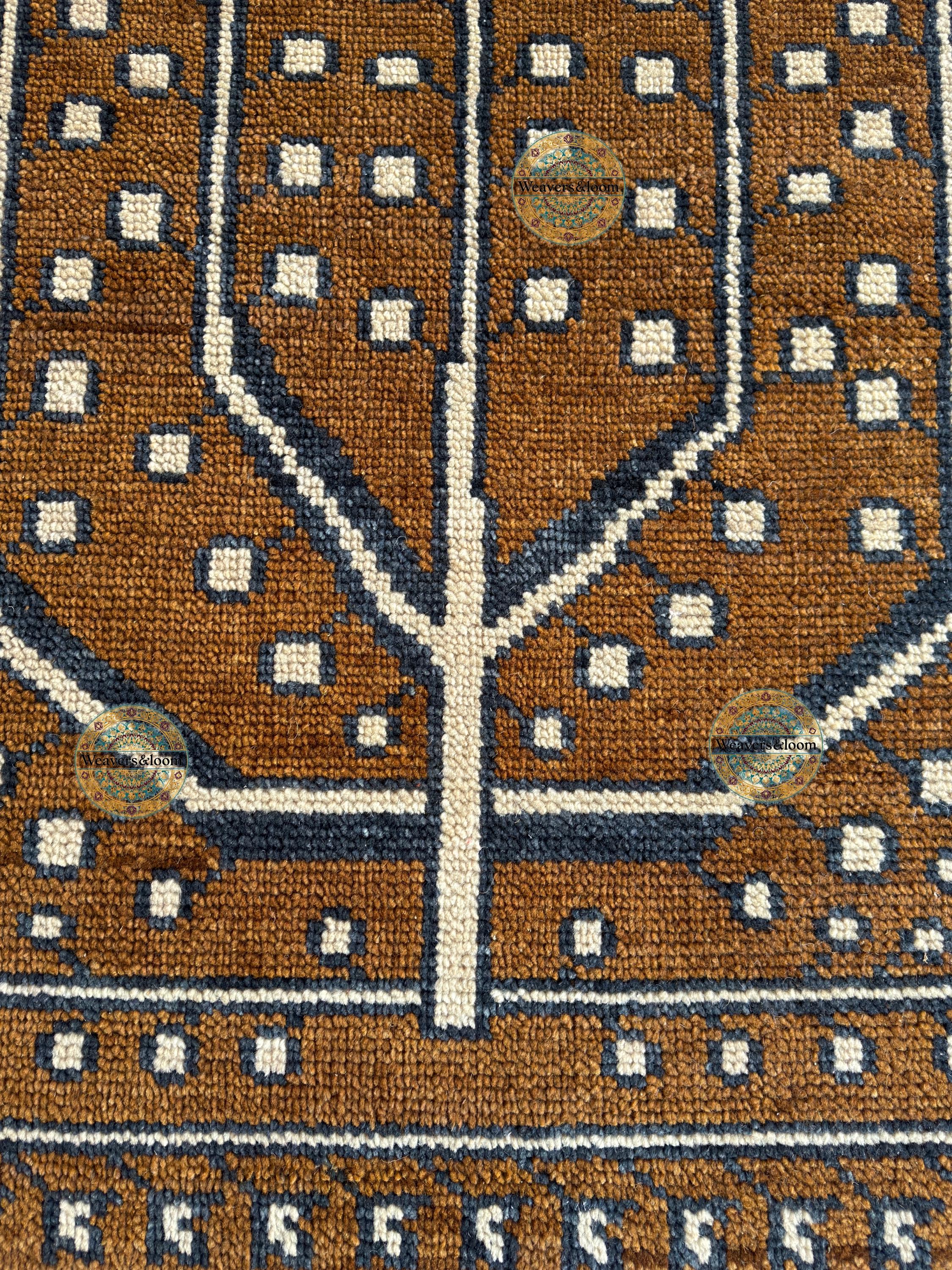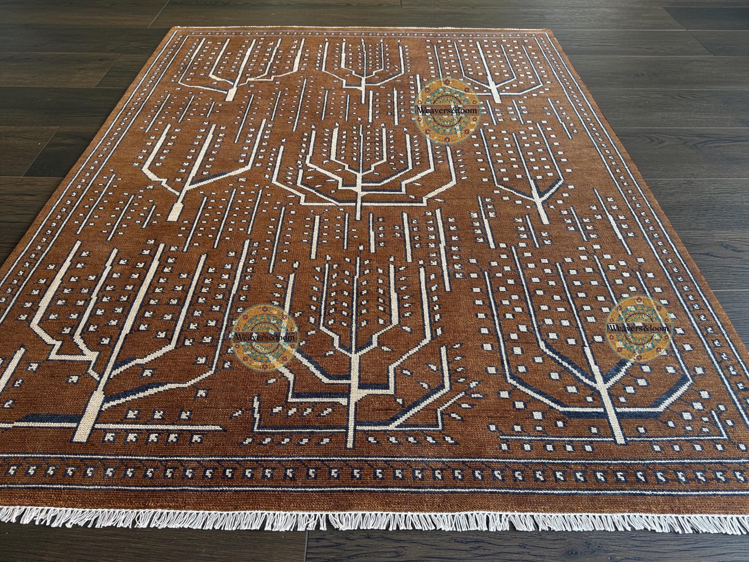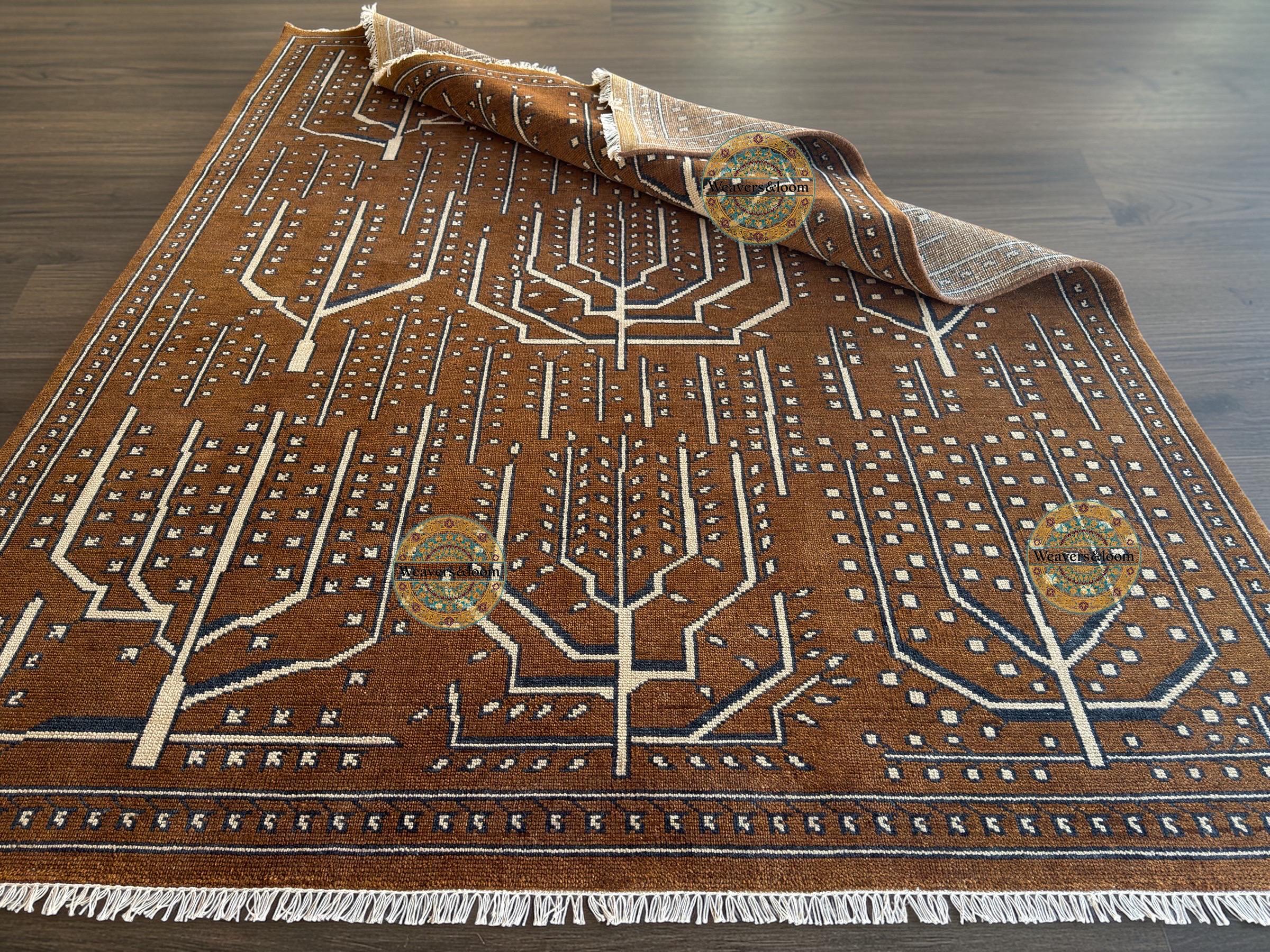Handwoven Brown Vintage Rug with Tree of Life Design – Bohemian Wool Area Carpet
