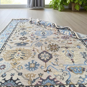 Quick ship 8x10 Hand Knotted Oushak Rug – Vintage Turkish Wool Area Rug in Blue & Ivory, Oriental Medallion Oushak for Living Room, Bedroom