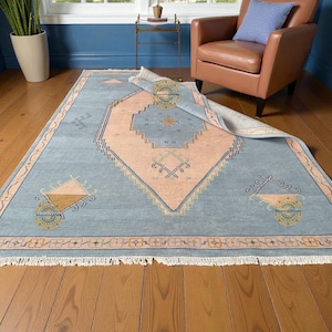 This rug in My Store is Made up of wool this exquisite hand-knotted rug is Low Pile Rug Which Is durable with a gentle feel. The defining details of this rug are sure to make it a conversation piece and an icon of your household. It is a joy to step out of bed in the morning onto these rugs and is also perfect for rolling out in a calming nursery or a delightful playroom.