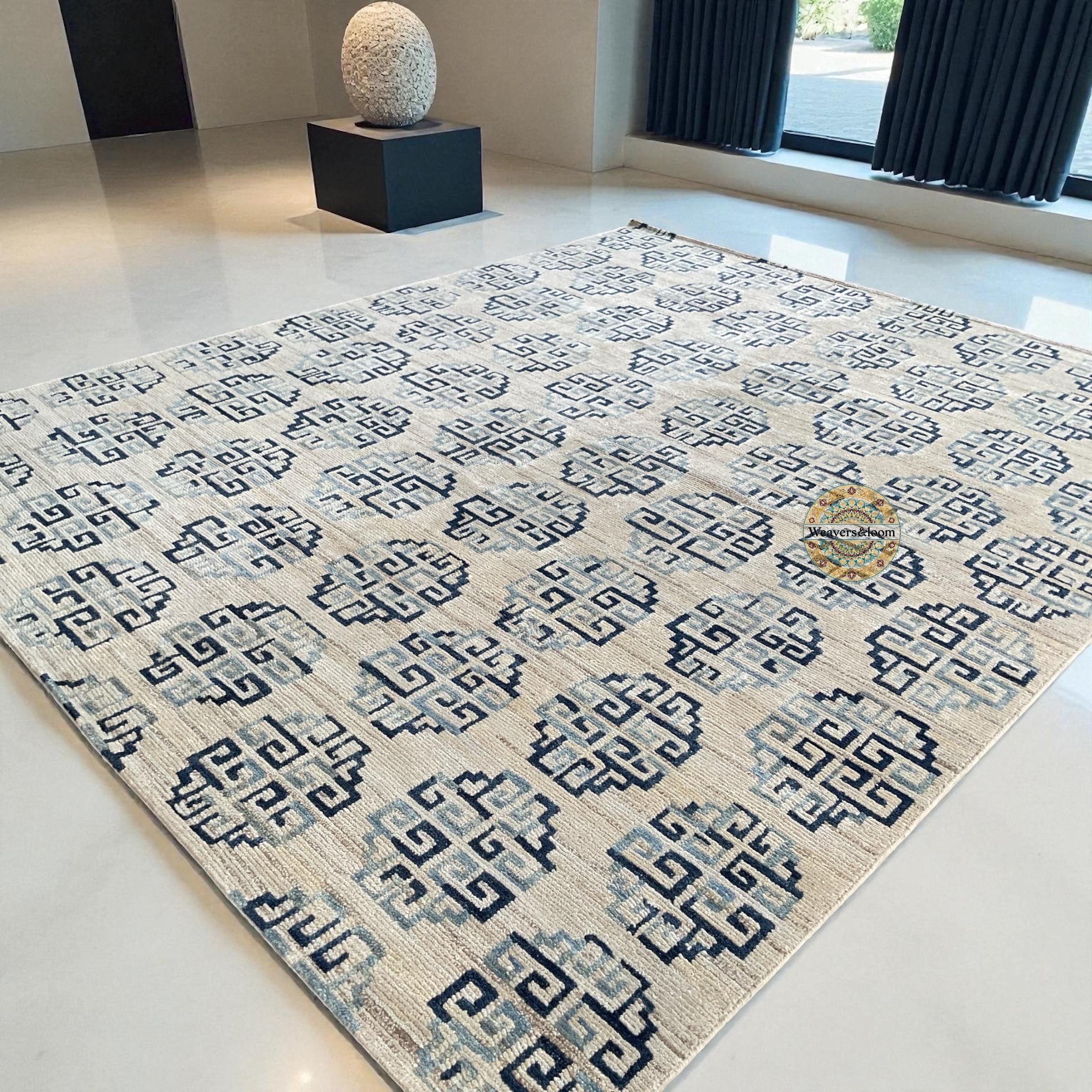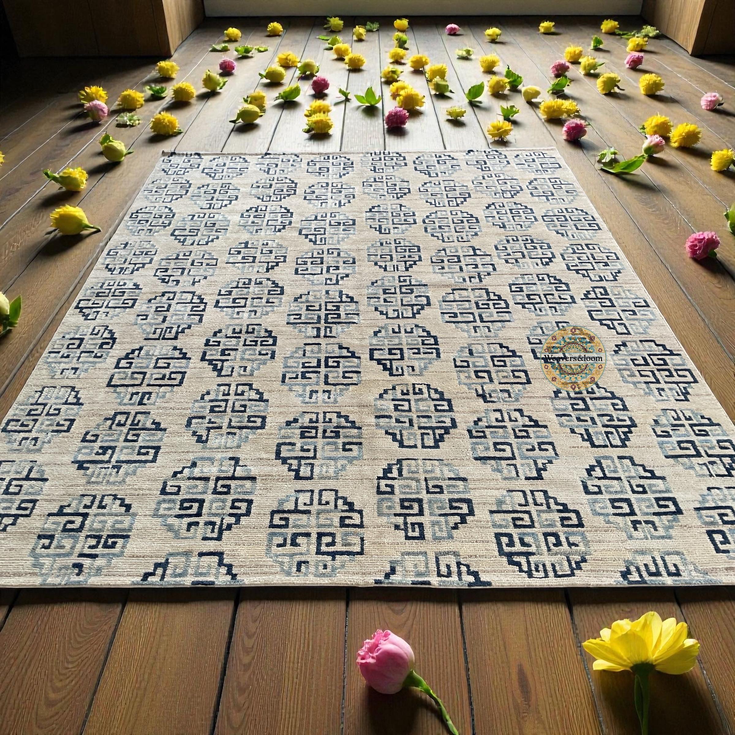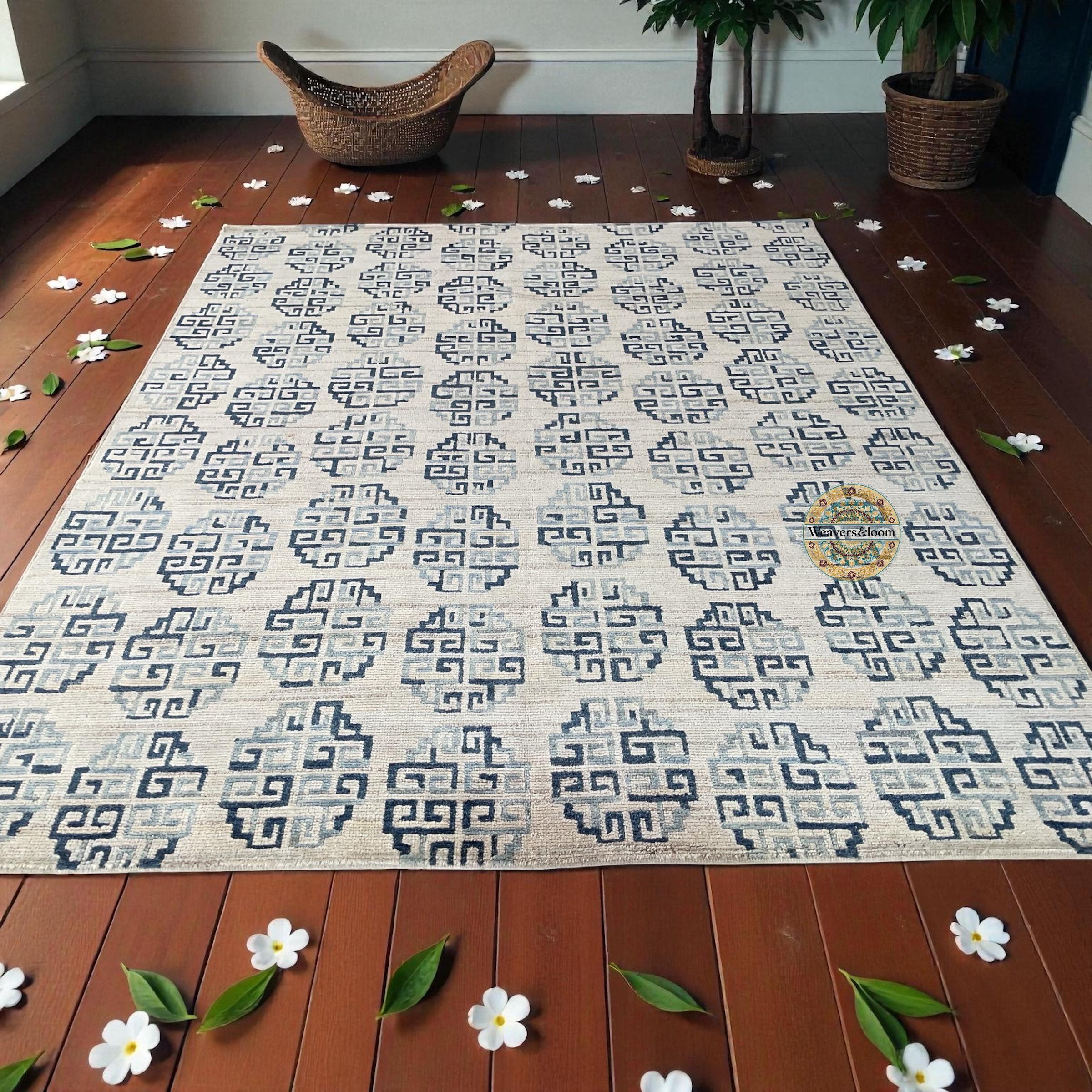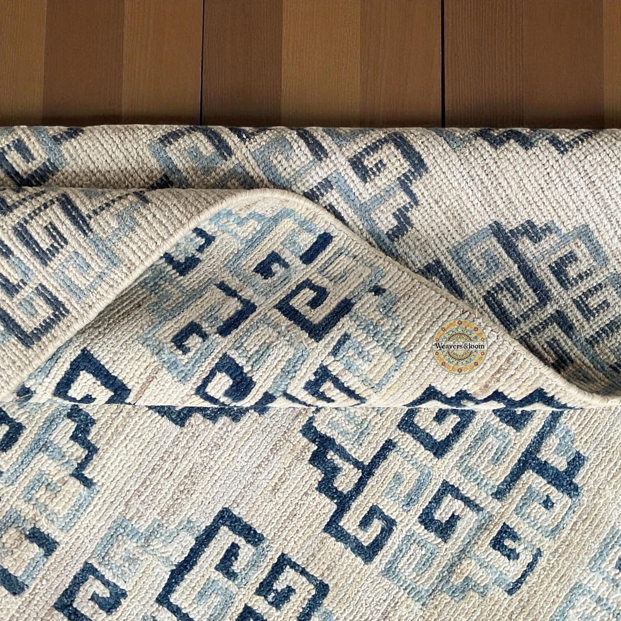 Modern Geometric Hand-Knotted Wool Rug,Handmade Rug Area Rug for Bedroom,Living Room,Dining Area,Office,Trending Wool Hand Knotted blue Rug