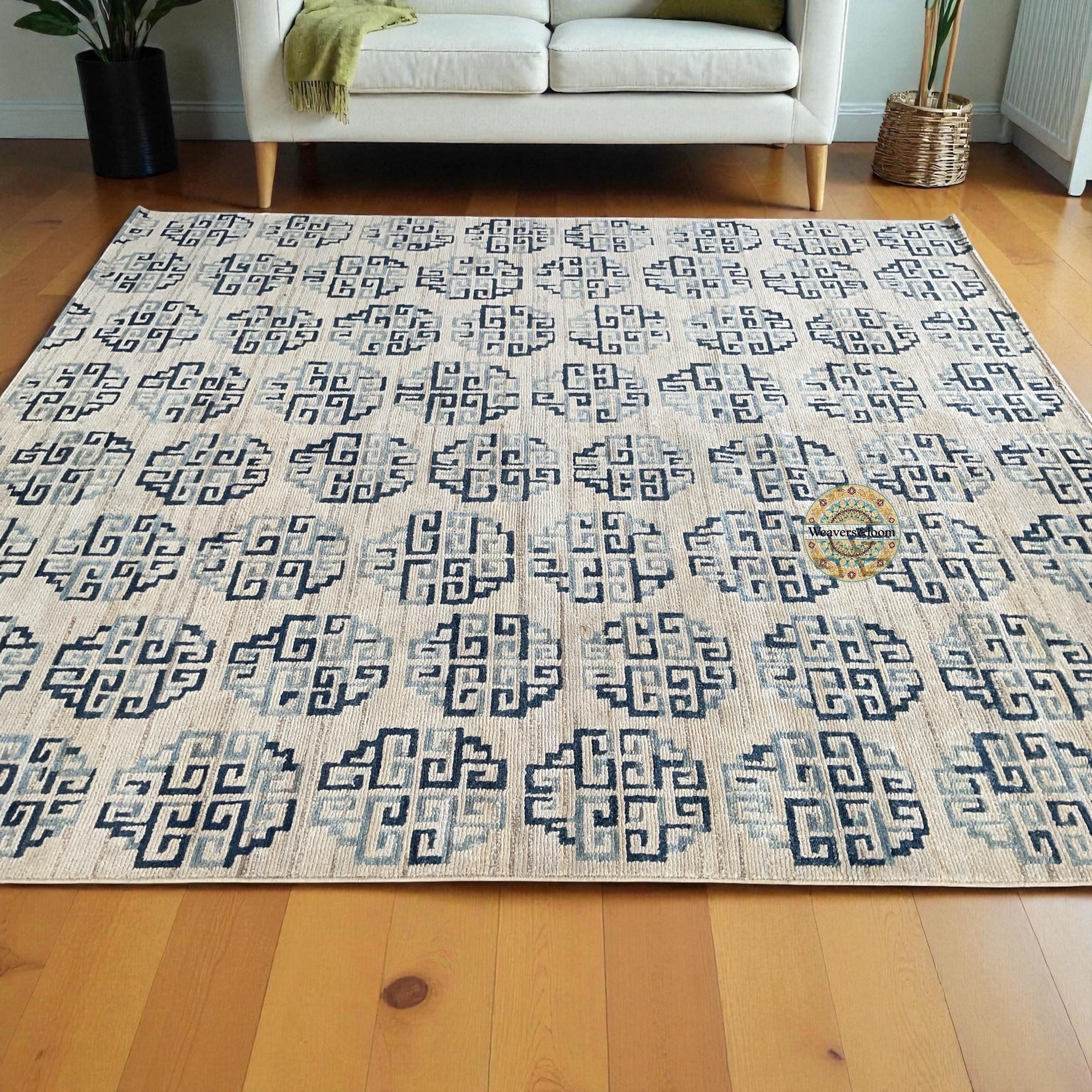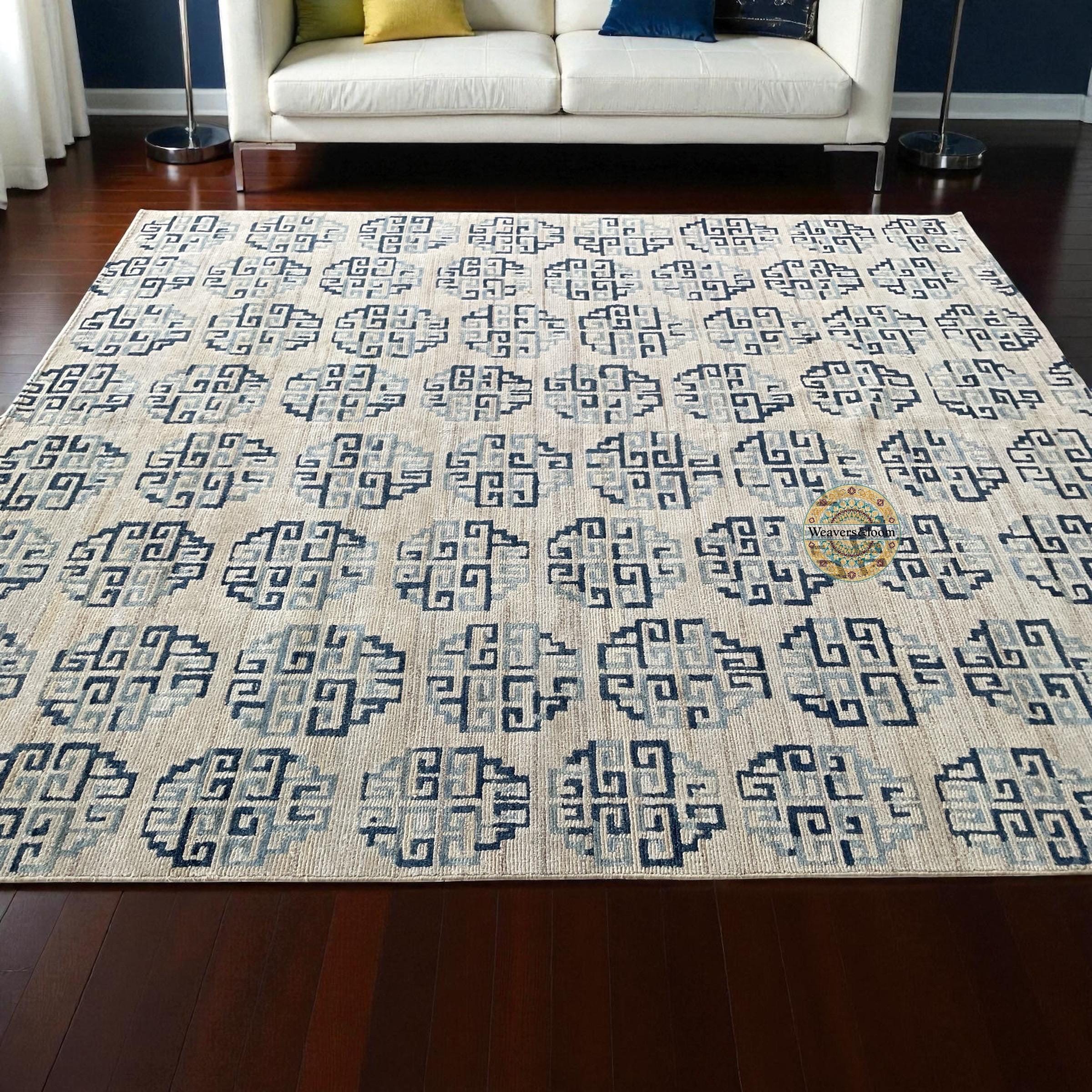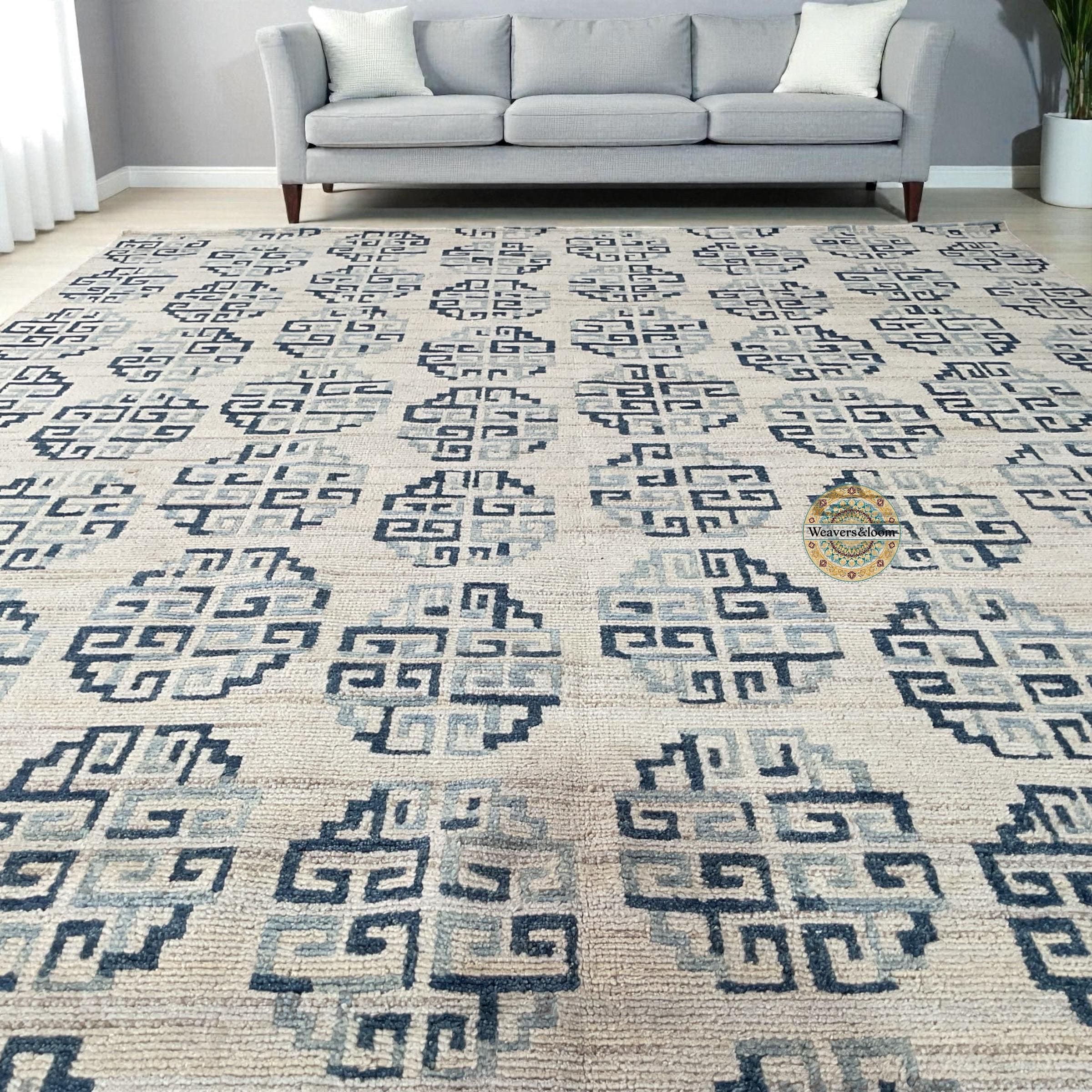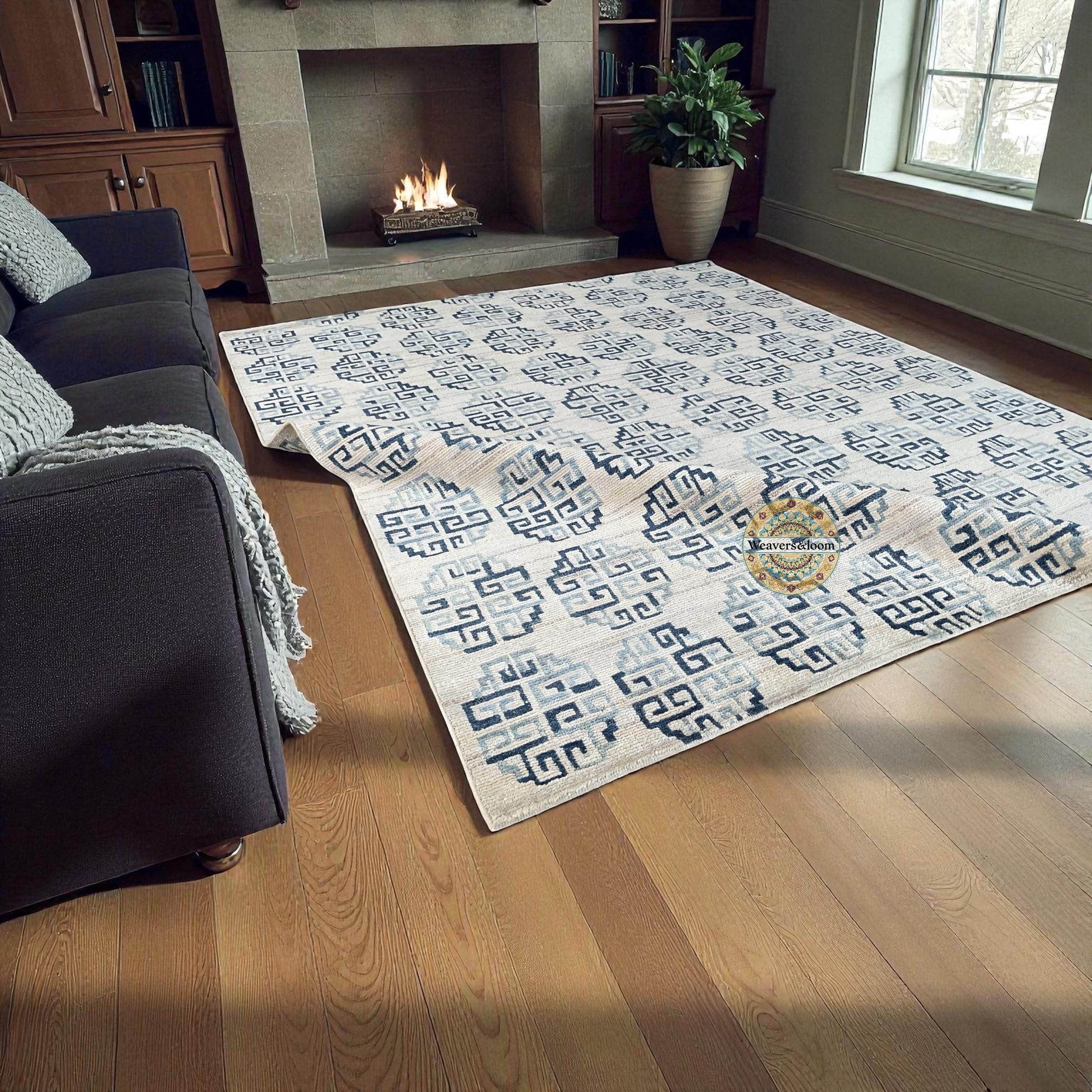 Modern Geometric Hand-Knotted Wool Rug,Handmade Rug Area Rug for Bedroom,Living Room,Dining Area,Office,Trending Wool Hand Knotted blue Rug