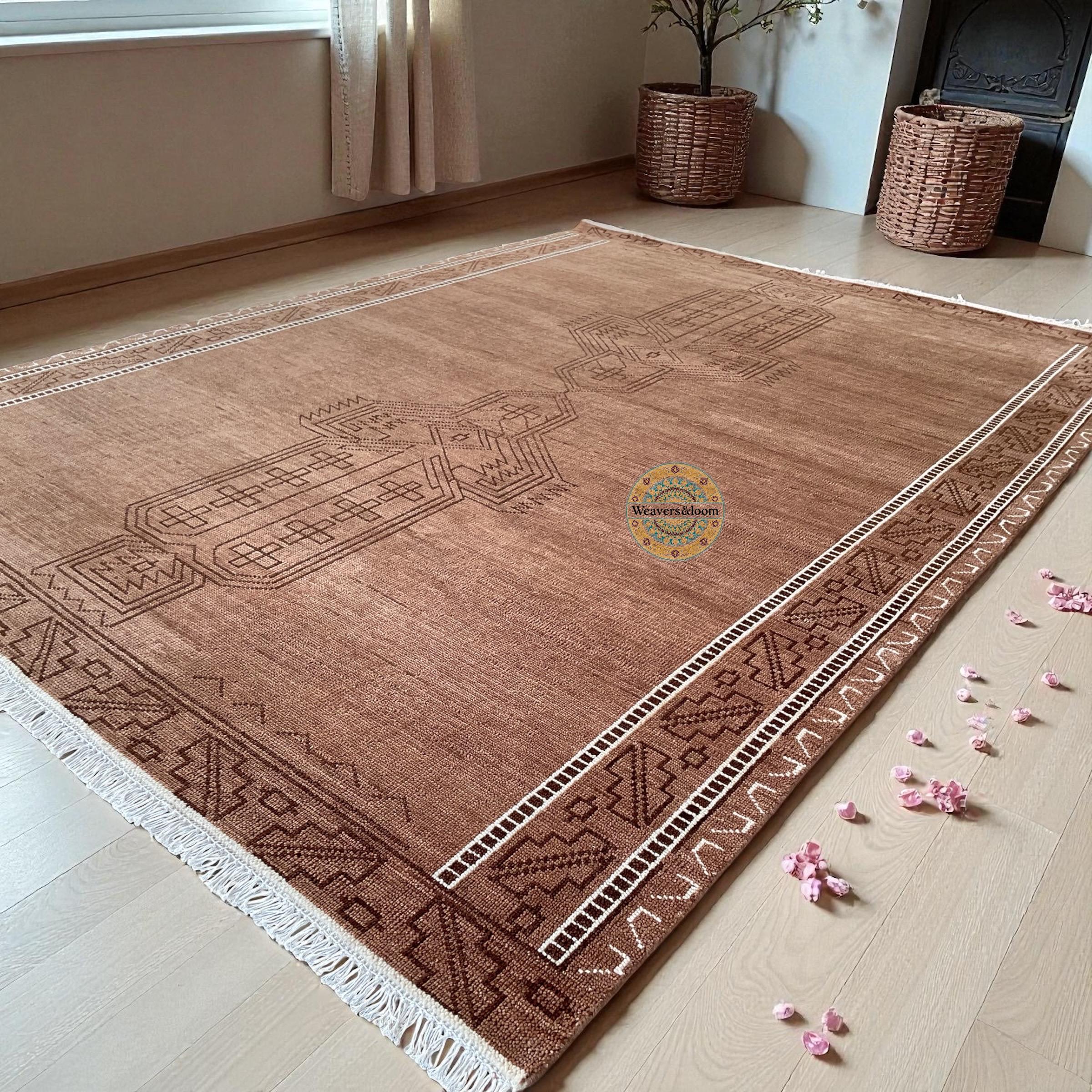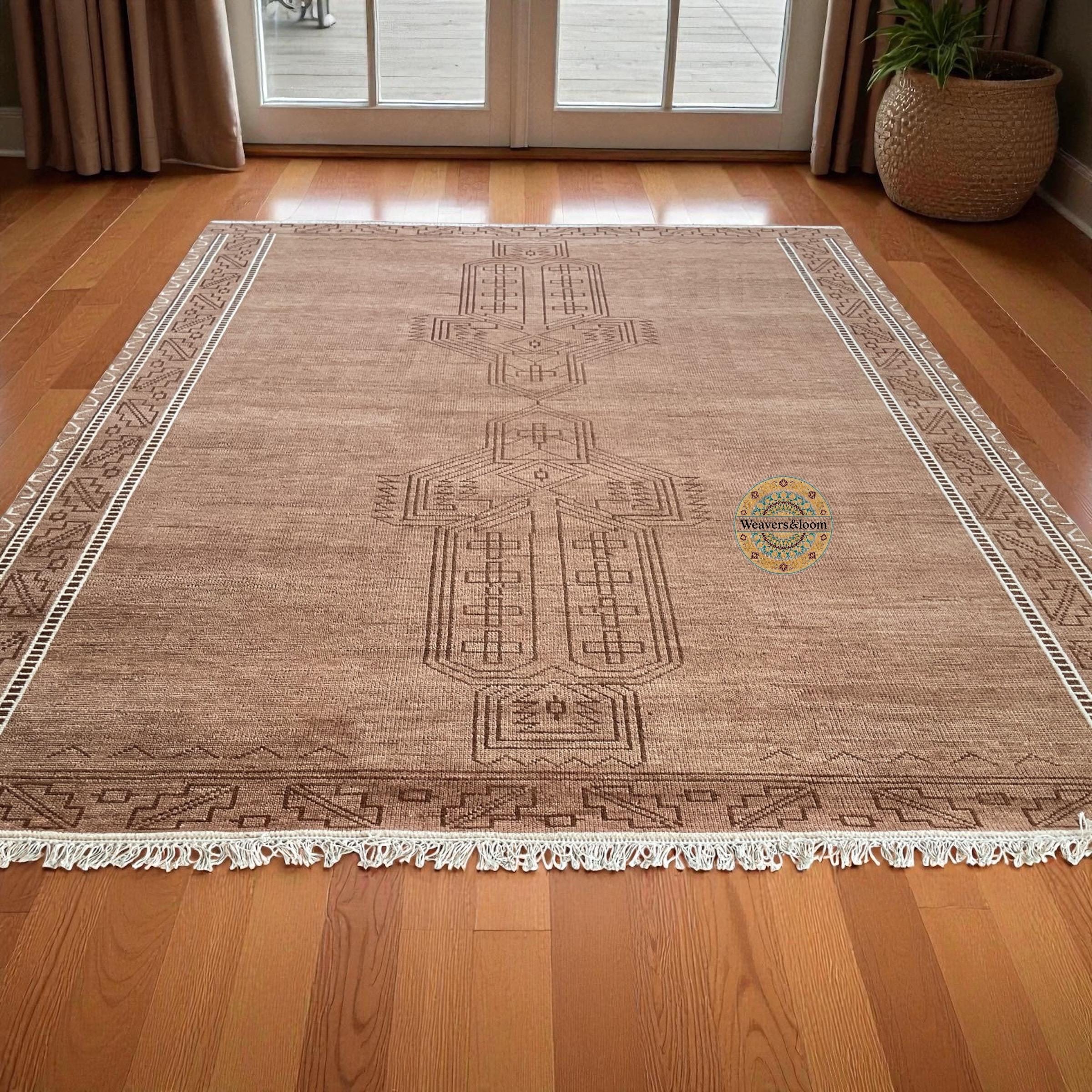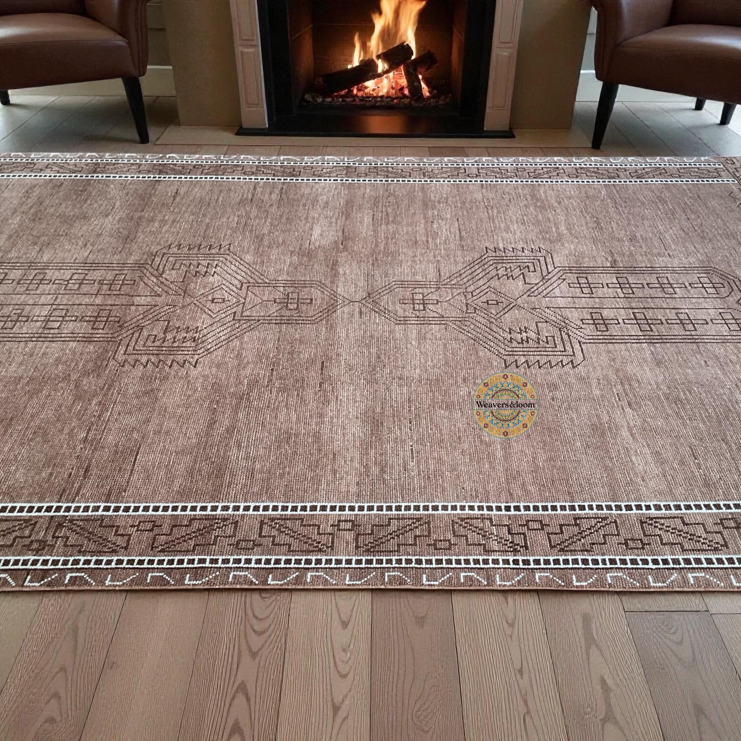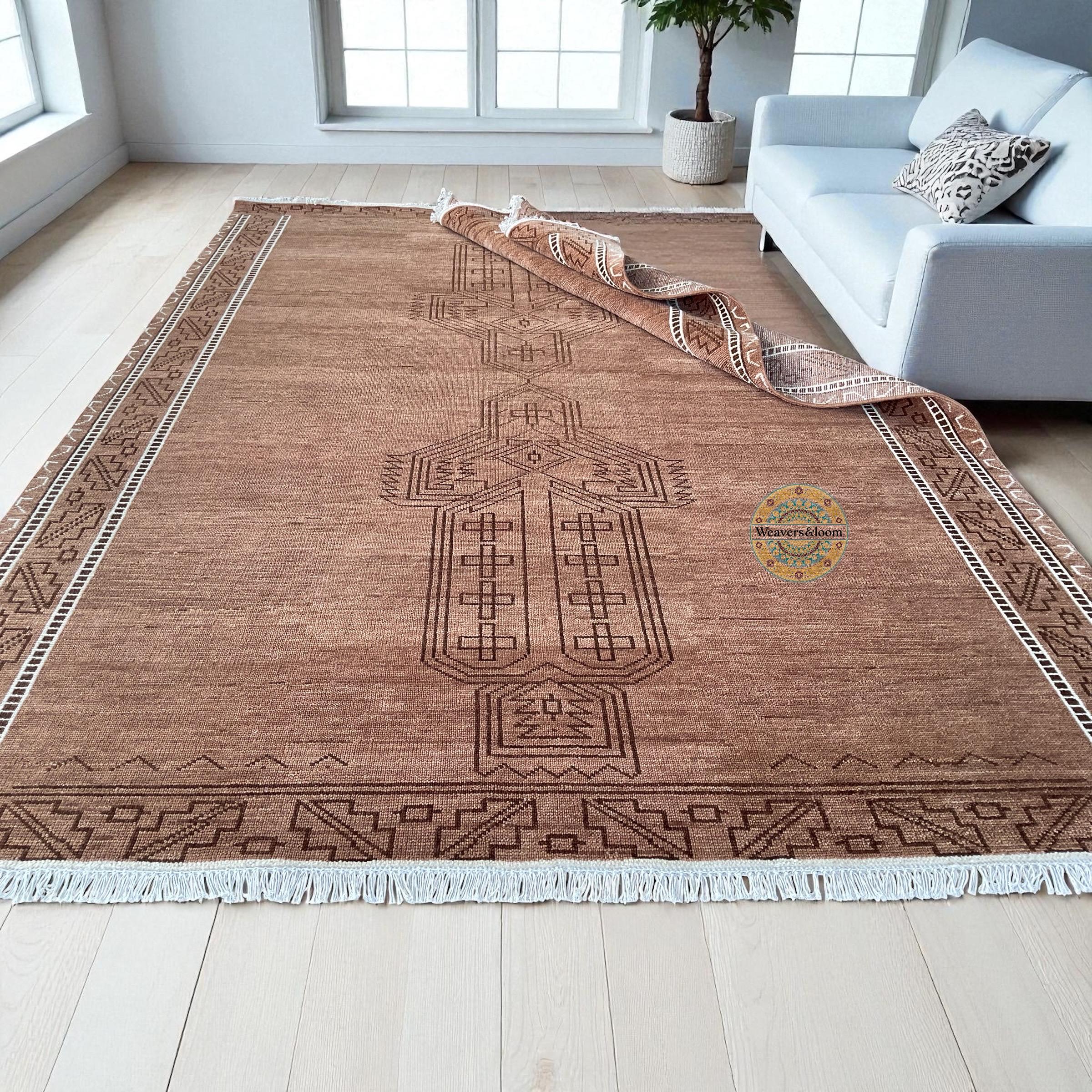 Handwoven Brown Vintage Rug with abstract Design – Bohemian Wool Area Carpet