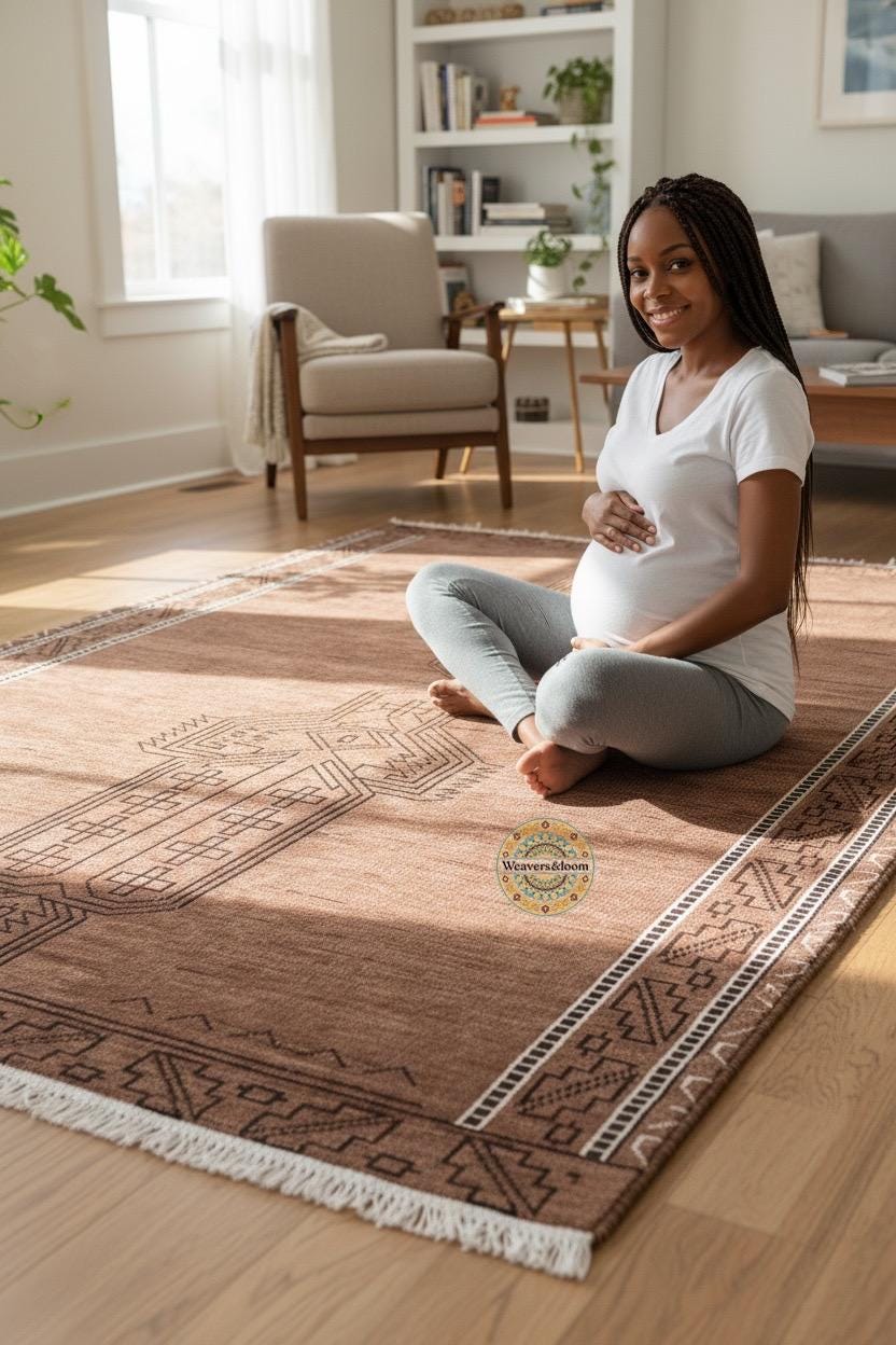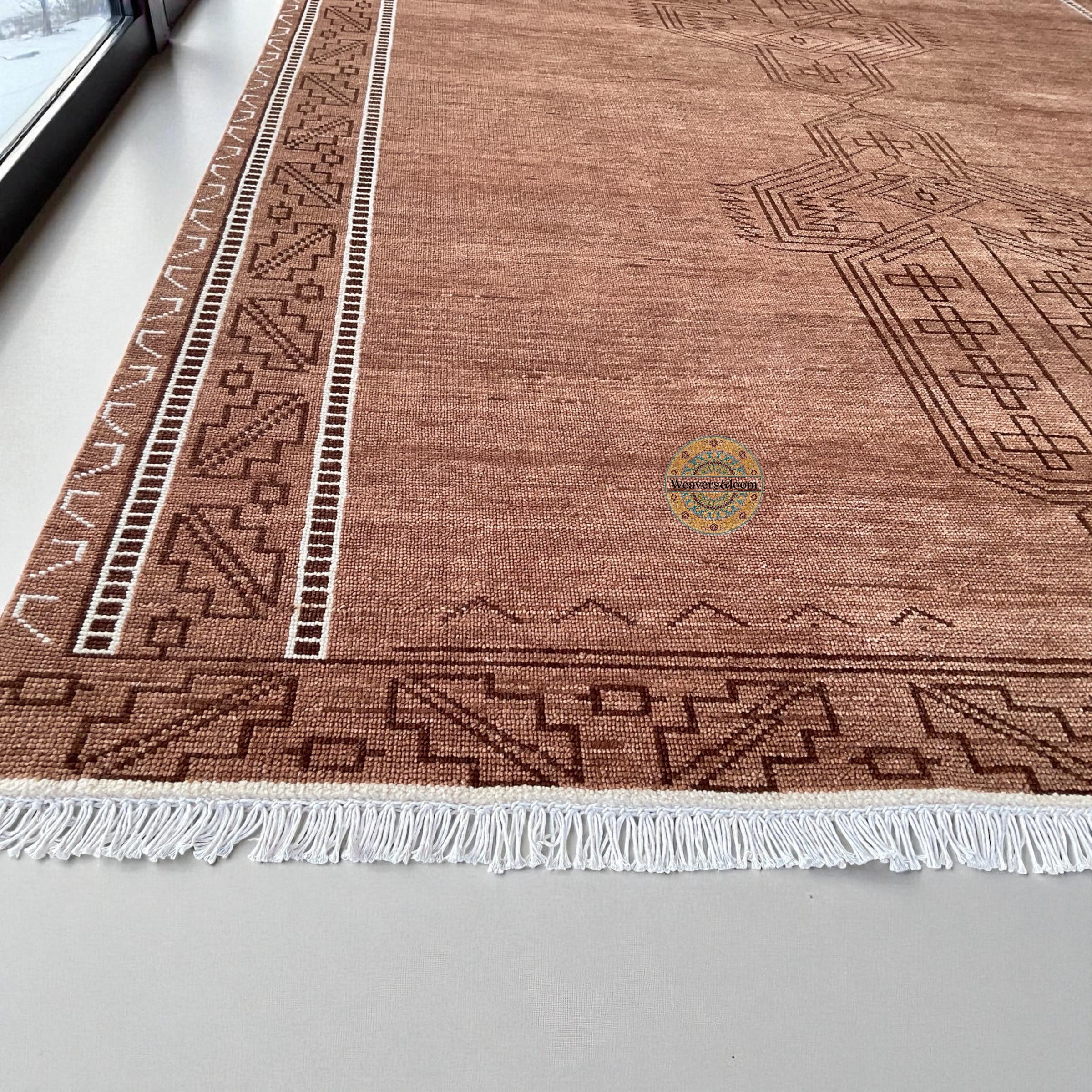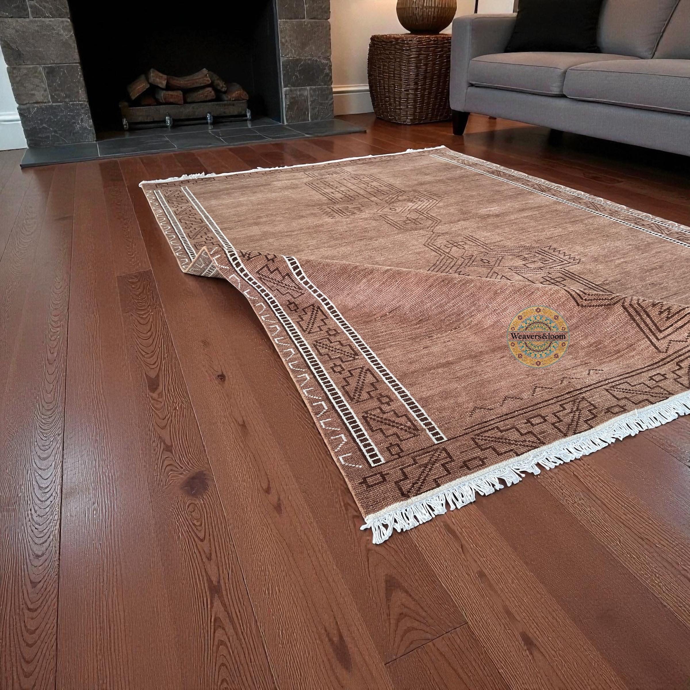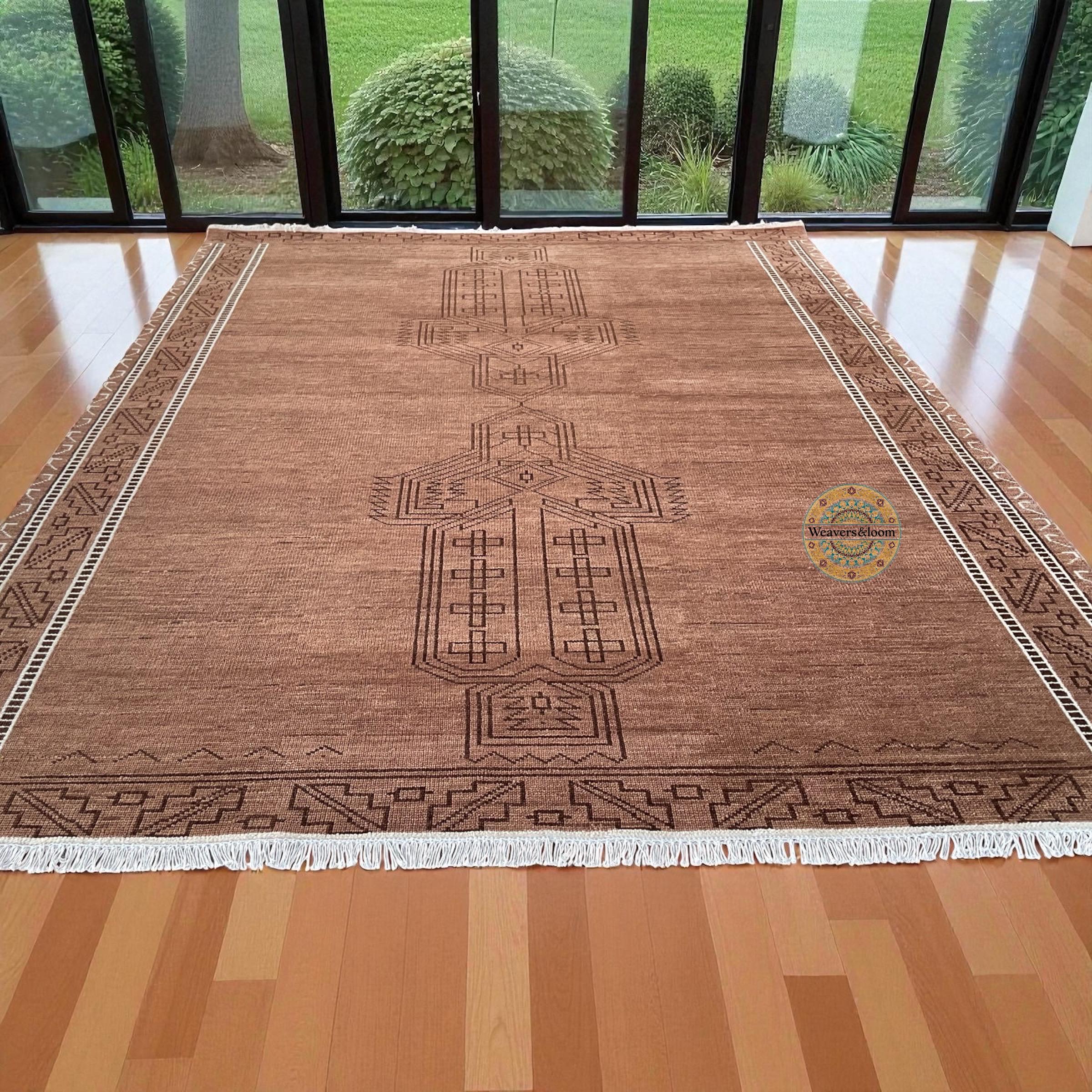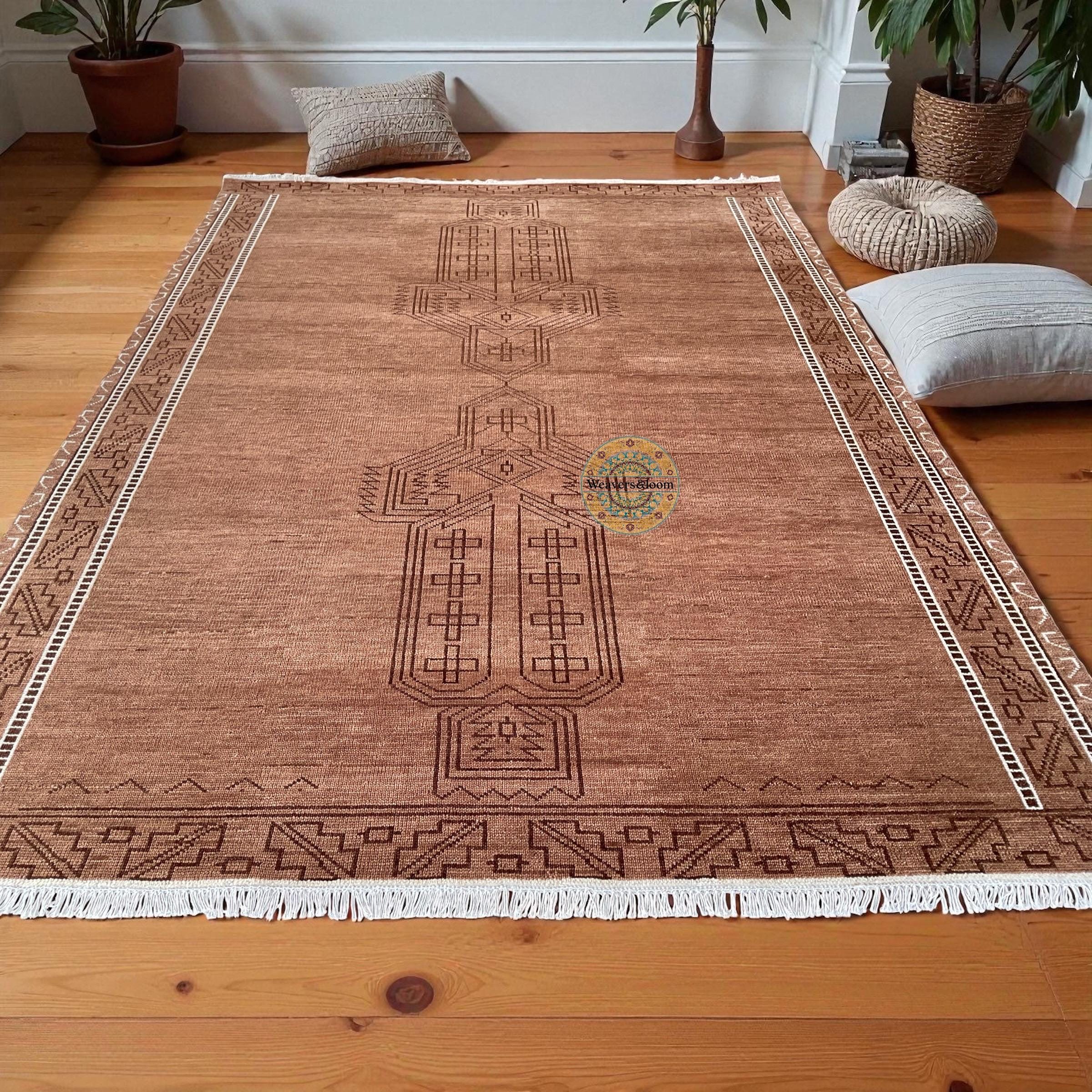 Handwoven Brown Vintage Rug with abstract Design – Bohemian Wool Area Carpet