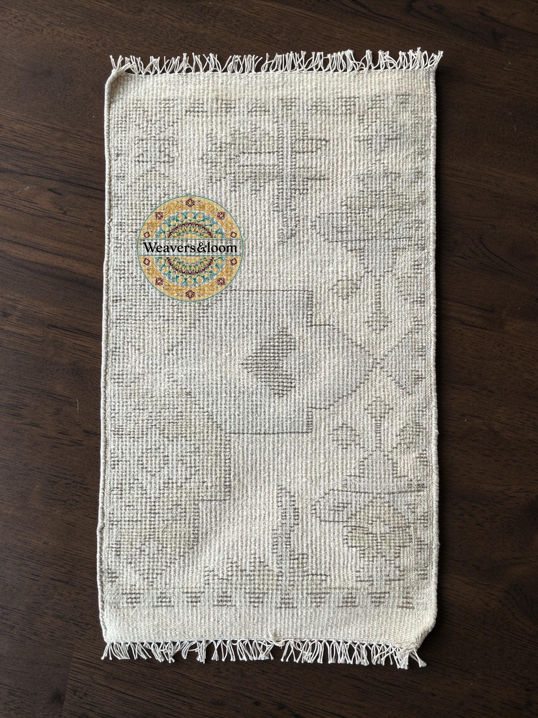 Bring subtle texture and artisan charm into your space with this beautifully handwoven flat weave rug. Crafted by skilled artisans, this rug features an ivory wool base accented with soft sky-blue raised motifs, creating a refined balance of minimal design and tactile depth. The hand-knotted detailing adds dimension while maintaining a lightweight, versatile flat weave construction.